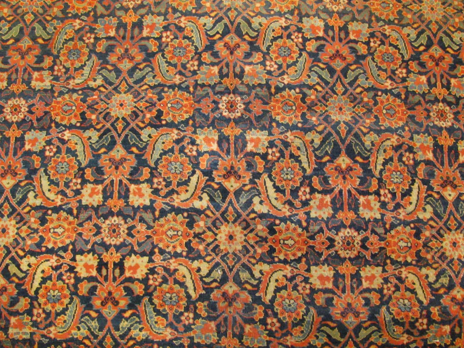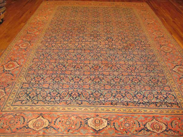 Our antique rugs’ collection includes Aubussons, Heriz and Serapi, Lavar and Kerman, Sarouk, Sultanabad, Tabriz, Oushak and Tapestries.  Tabriz rugs are not distinguished necessarily by a specific pattern or color, although there are some common themes that one can recognize.  Instead, these Persian rugs are known for their high quality and diversity of types.  The tradition in Tabriz is one of the oldest in all of Iran.  Within the rug-making world, families would pass down the skills as an heirloom for future generations.  Centuries of rug weaving have resulted in the fine quality still seen with Tabriz rugs today.
