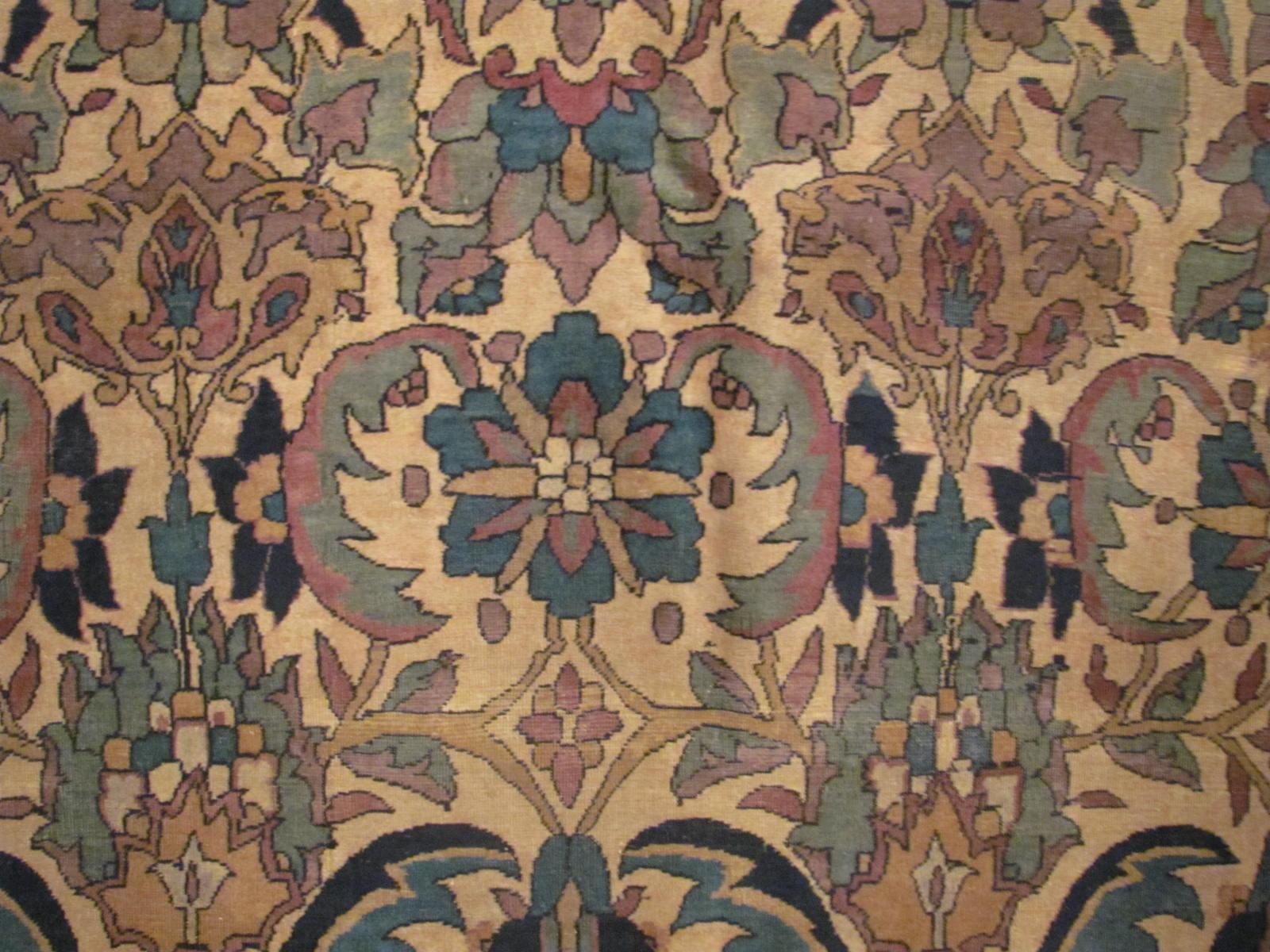 Kerman rugs are renowned for distinct design patterns. The most recognizable pattern within Kerman carpets was coined the vase carpet pattern. This specific pattern arose in the late 16th century and early 17th century and refers to rugs with scattered vases within a background of flowers, palmettes or similar motifs using an all over pattern. This unique and storied pattern was desired by many. Other Kerman carpets had exquisite curvilinear all over design patterns that demonstrate the amazing skills of the weavers. Some rugs had complex central medallions with complex edges again illustrating the superior craftsmanship of the master weavers.Â
