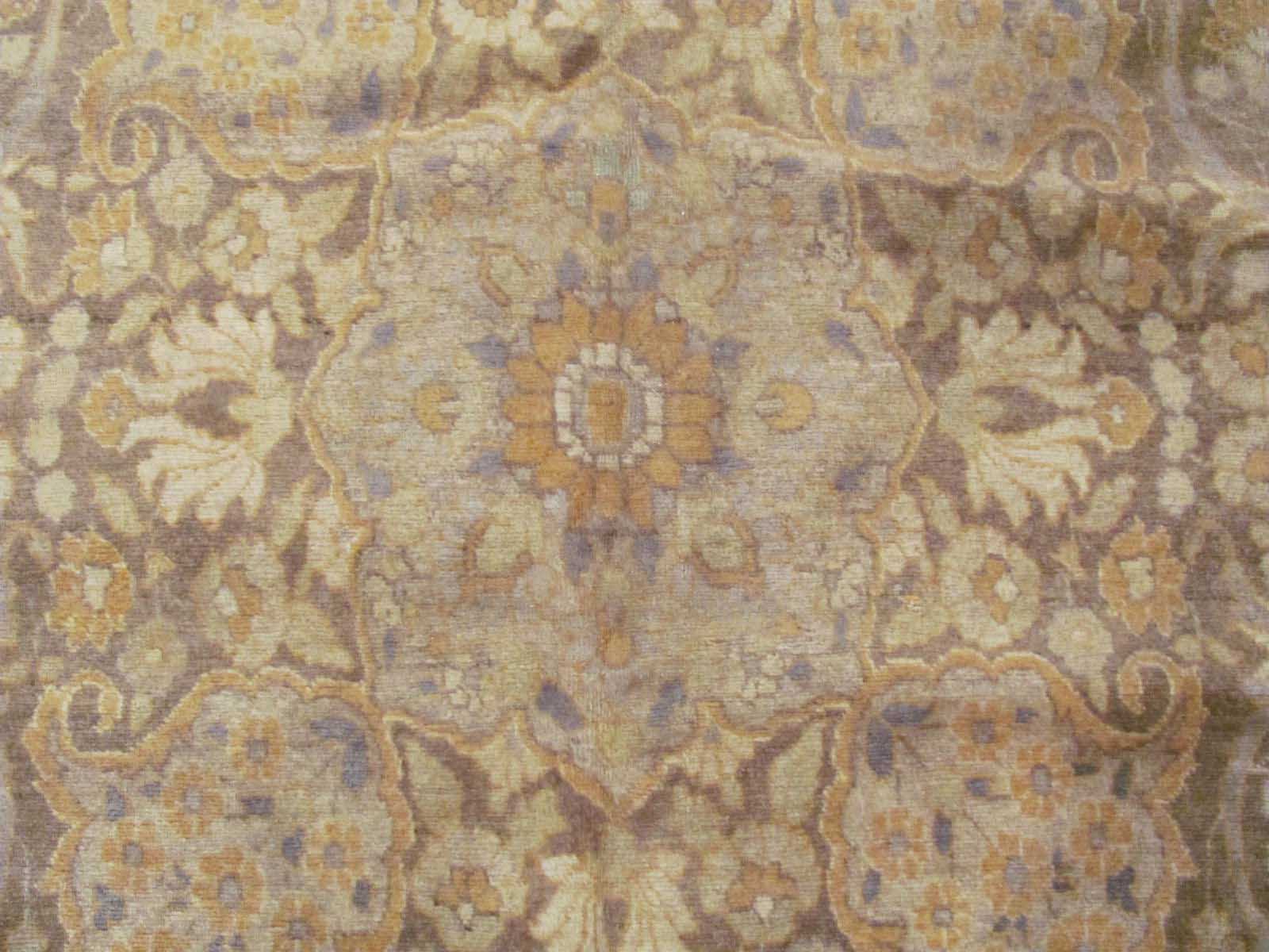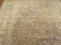 Patterns that were common to see with Tabriz rugs include a classical central medallion with a border weave of fish scales, leaves, stems or flowers.  The border design is often fine and detailed and has been described as lacelike.  Background color was usually cream, red or navy blue.  Coloration typically consisted of soft pastels.  Other patterns you may find include all over patterns or pictorial patterns.  We have a large collection of antique oriental rugs including Persian, Indian, Turkish, Caucasian, Chinese and European rugs. Tabriz rug designers were influenced by Oriental poetry and these influences often were manifested in the design of the rug pattern.  Pictorial patterns of falconry, battle scenes, palaces and even lions are occasionally seen.
