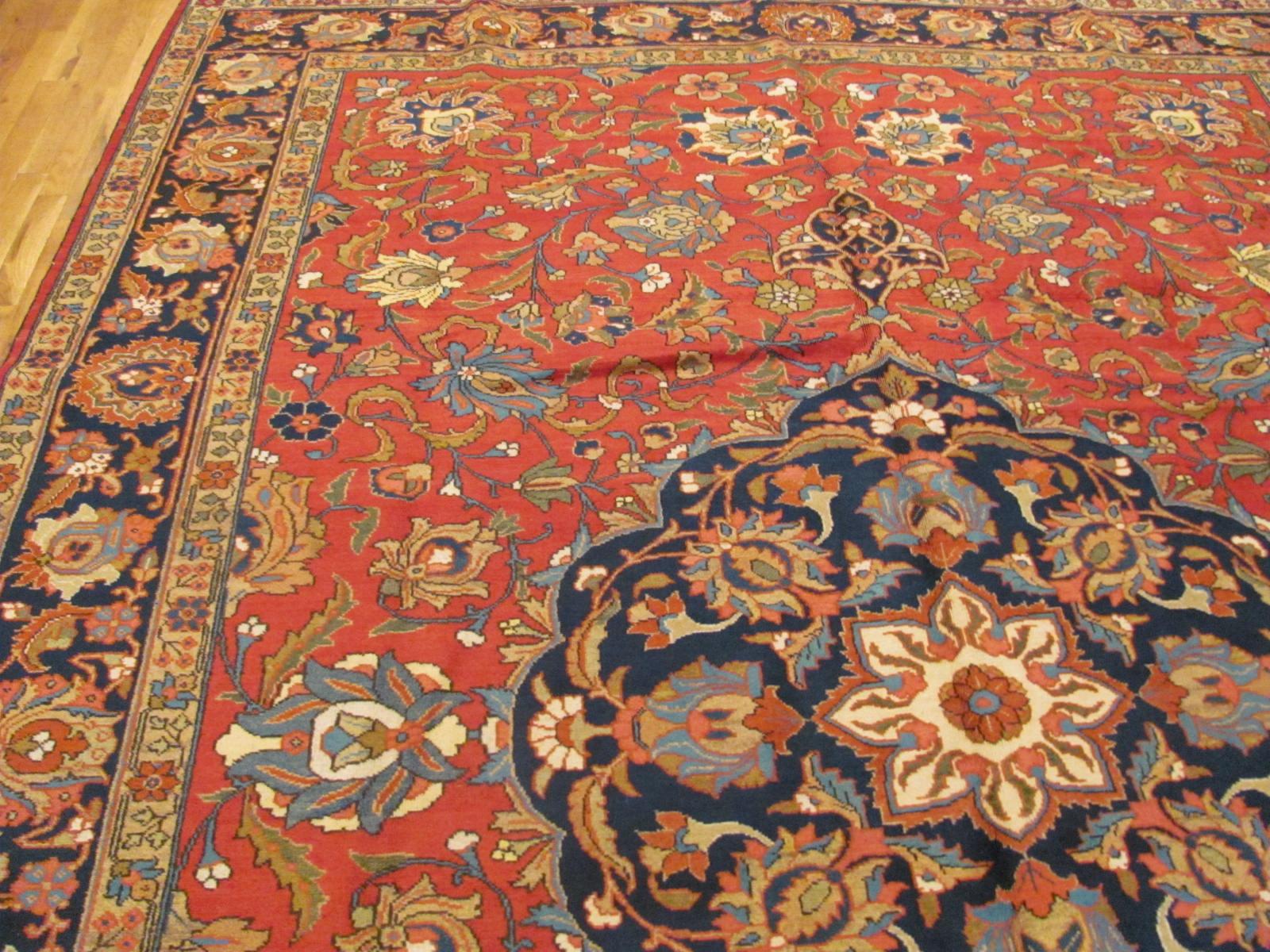 Our antique rugs’ collection includes Aubussons, Heriz and Serapi, Lavar and Kerman, Sarouk, Sultanabad, Tabriz, Oushak and Tapestries.  Tabriz rugs are not distinguished necessarily by a specific pattern or color, although there are some common themes that one can recognize.  Instead, these Persian rugs are known for their high quality and diversity of types.  The tradition in Tabriz is one of the oldest in all of Iran.  Within the rug-making world, families would pass down the skills as an heirloom for future generations.  Centuries of rug weaving have resulted in the fine quality still seen with Tabriz rugs today.