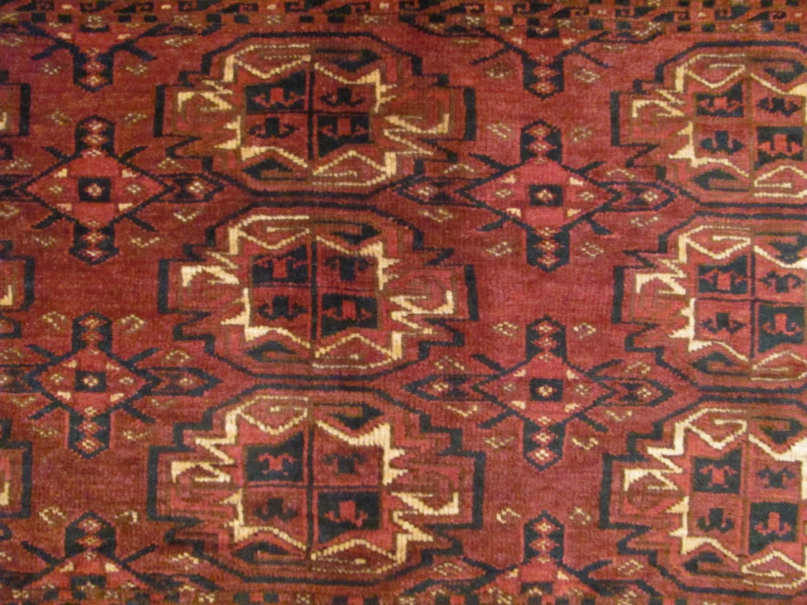 Turkoman rugs use a unique shape called GUL. GUL is an octagonal motif weaved all over on the rug. Sometimes, these GULS are woven in repeated patterns e.g., smaller GULS inside the larger ones. They are sometimes woven in rows. Common colors used in these rugs are white, blue, black, and beige. It is an interesting fact that the word “GUL” is derived from the Turkish word for family. Hatchli design is another less frequent design used in these rugs. This design is used in “ensi” rug which was originally designed to cover the doors.