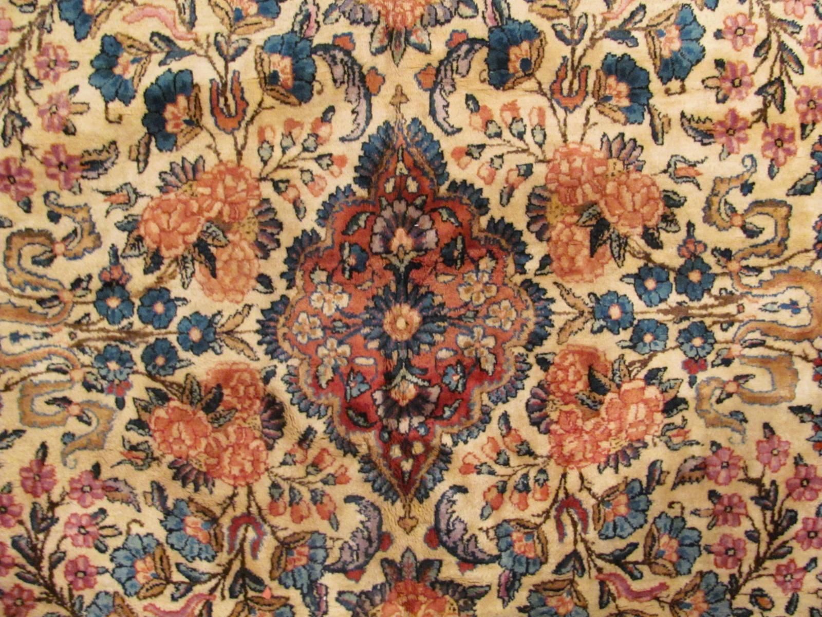 Kerman rugs are renowned for distinct design patterns. The most recognizable pattern within Kerman carpets was coined the vase carpet pattern. This specific pattern arose in the late 16th century and early 17th century and refers to rugs with scattered vases within a background of flowers, palmettes or similar motifs using an all over pattern. This unique and storied pattern was desired by many. Other Kerman carpets had exquisite curvilinear all over design patterns that demonstrate the amazing skills of the weavers. Some rugs had complex central medallions with complex edges again illustrating the superior craftsmanship of the master weavers.Â