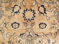 Apart from taking inspiration from Persian art crafts, Indian craftsmen also have drawn influence from Chinese. Chinese style Indian rugs are peculiar for the uniqueness in border designs. The borders in these forms of rugs usually have geometric design filled with solid color. Main motifs used in these form of rugs are usually blue in color. Some craftsmen prefer to use pink and white color in motifs. There is also an evident taste in the selection of background colors. Yellow, ivory, peach etc are some of the commonly used background colors.
