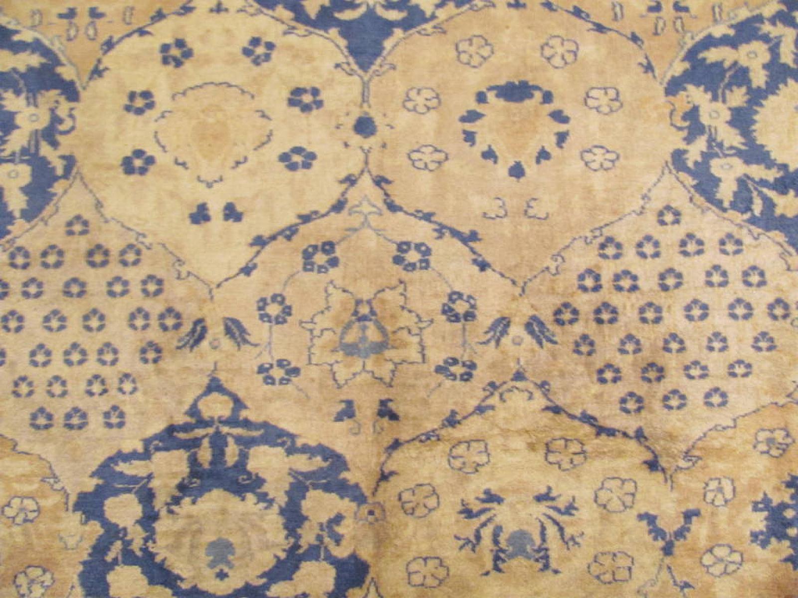 Apart from taking inspiration from Persian art crafts, Indian craftsmen also have drawn influence from Chinese. Chinese style Indian rugs are peculiar for the uniqueness in border designs. The borders in these forms of rugs usually have geometric design filled with solid color. Main motifs used in these form of rugs are usually blue in color. Some craftsmen prefer to use pink and white color in motifs. There is also an evident taste in the selection of background colors. Yellow, ivory, peach etc are some of the commonly used background colors.