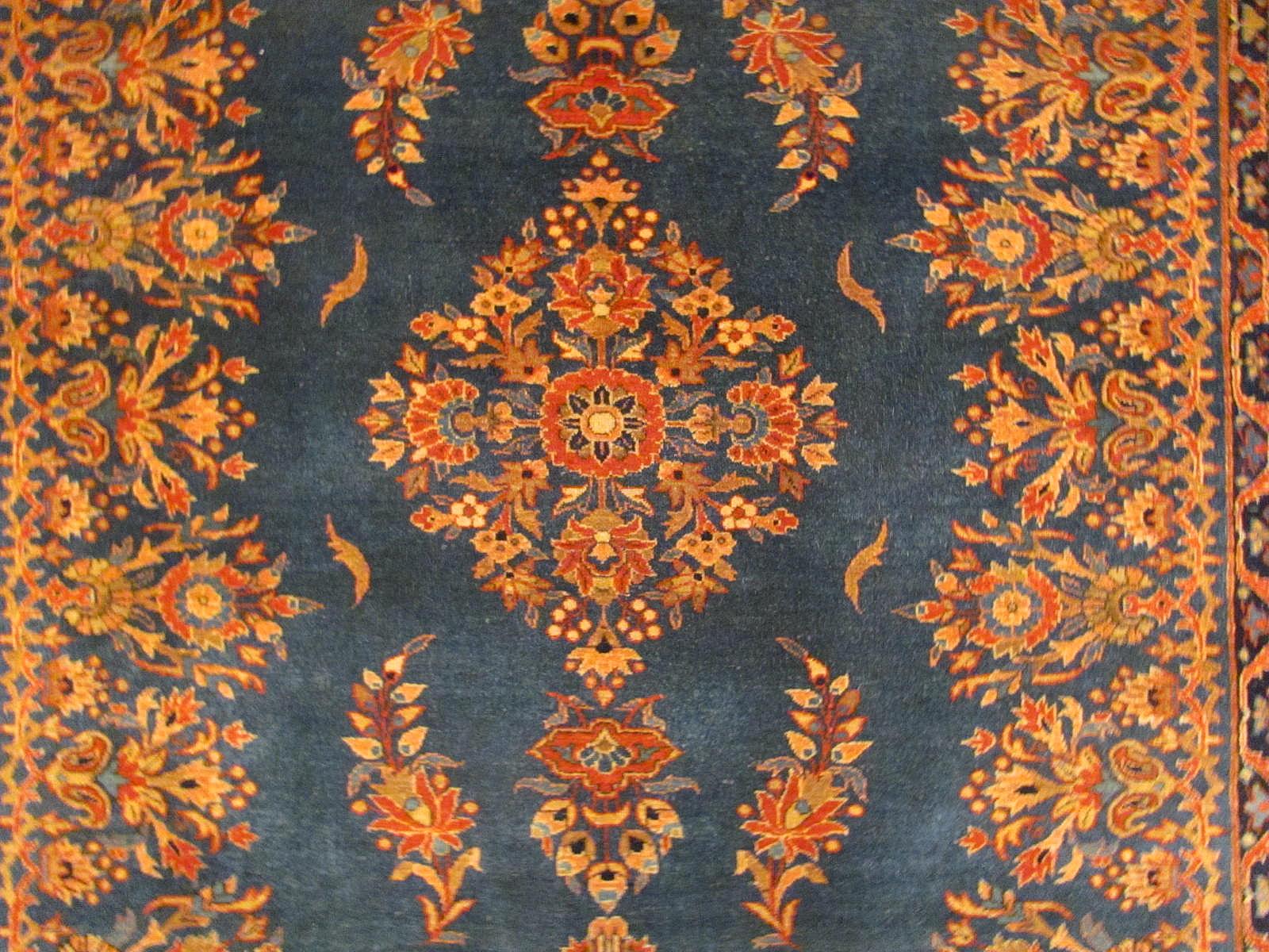 Kashan rugs are typically made with wool or cotton pile.  The finer rugs are made with silk.  Occasionally, you can find these classic beauties made of special wool referred to as kurk wool from the neck of lamb.  These rugs, like many ancient Persian rugs, typically contain a large central medallion with a surrounding geometric pattern.  These rigs may have a dense pattern with intricately designed motifs including florals, arabesques, palmettos, rosettes and leaves.  The dominant or background colors vary and include blues, reds, light greens and beiges. Kashan rugs may come in any size, however, the most common is a mid-size rug.  Like their other Persian rug counterparts, these hand woven masterpieces are revered for their high density knot counts using a Persian knot and their unique intricate design.  Some of these patterns and styles have been passed down from generation to generation from before the 17th century,