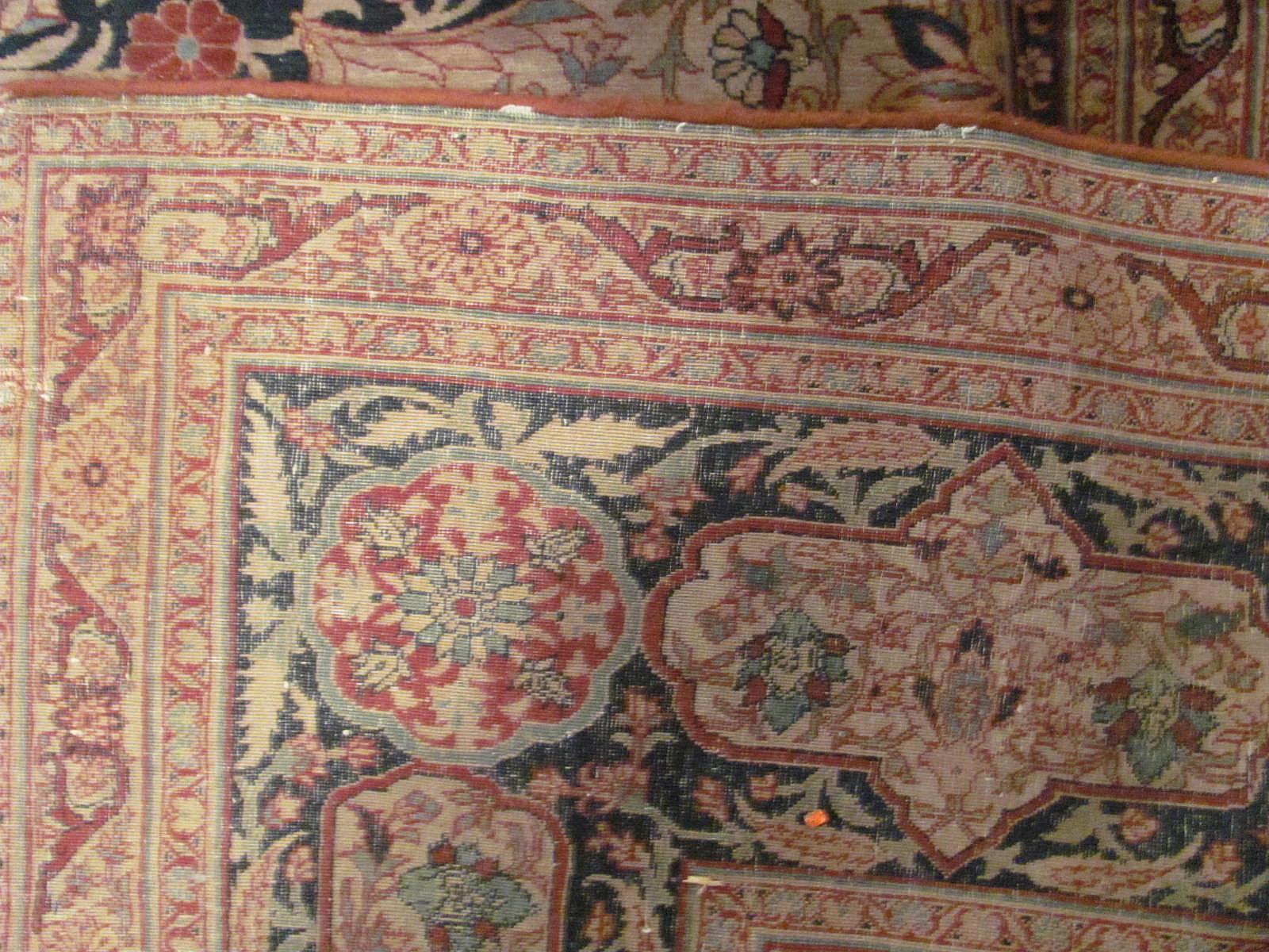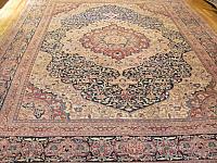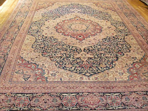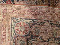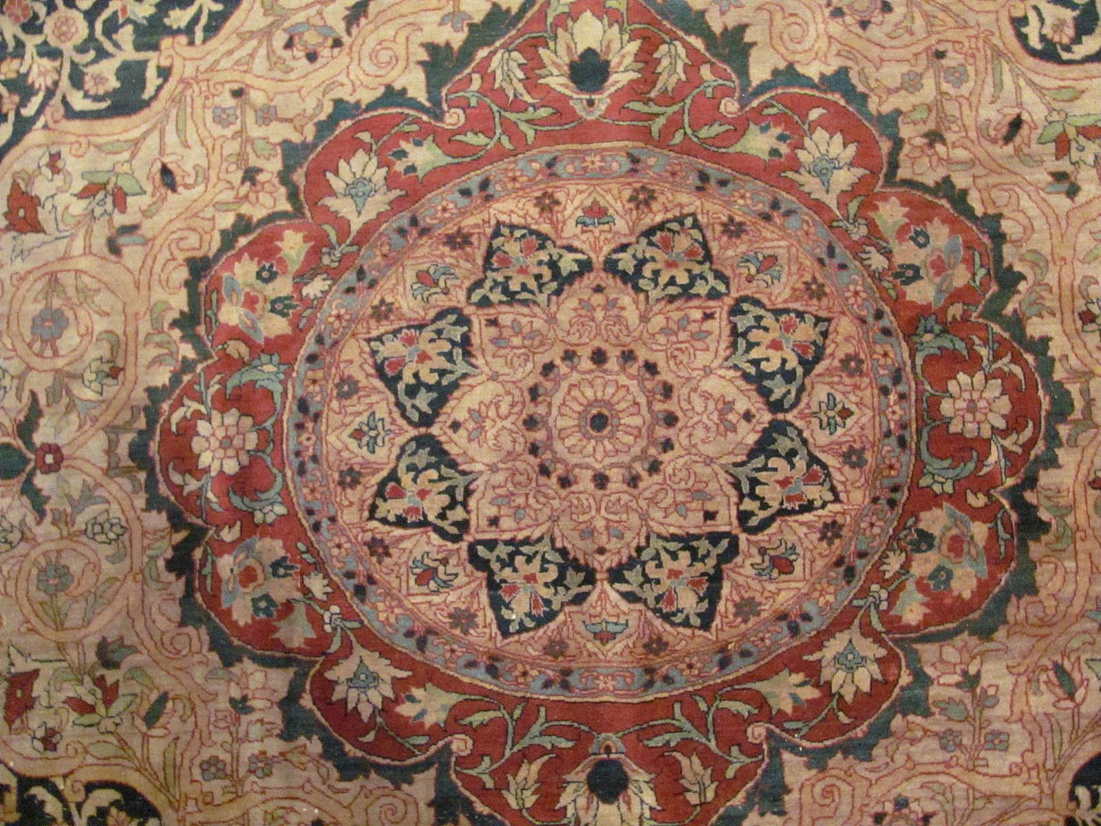 Patterns that were common to see with Tabriz rugs include a classical central medallion with a border weave of fish scales, leaves, stems or flowers.  The border design is often fine and detailed and has been described as lacelike.  Background color was usually cream, red or navy blue.  Coloration typically consisted of soft pastels.  Other patterns you may find include all over patterns or pictorial patterns.  We have a large collection of antique oriental rugs including Persian, Indian, Turkish, Caucasian, Chinese and European rugs. Tabriz rug designers were influenced by Oriental poetry and these influences often were manifested in the design of the rug pattern.  Pictorial patterns of falconry, battle scenes, palaces and even lions are occasionally seen.