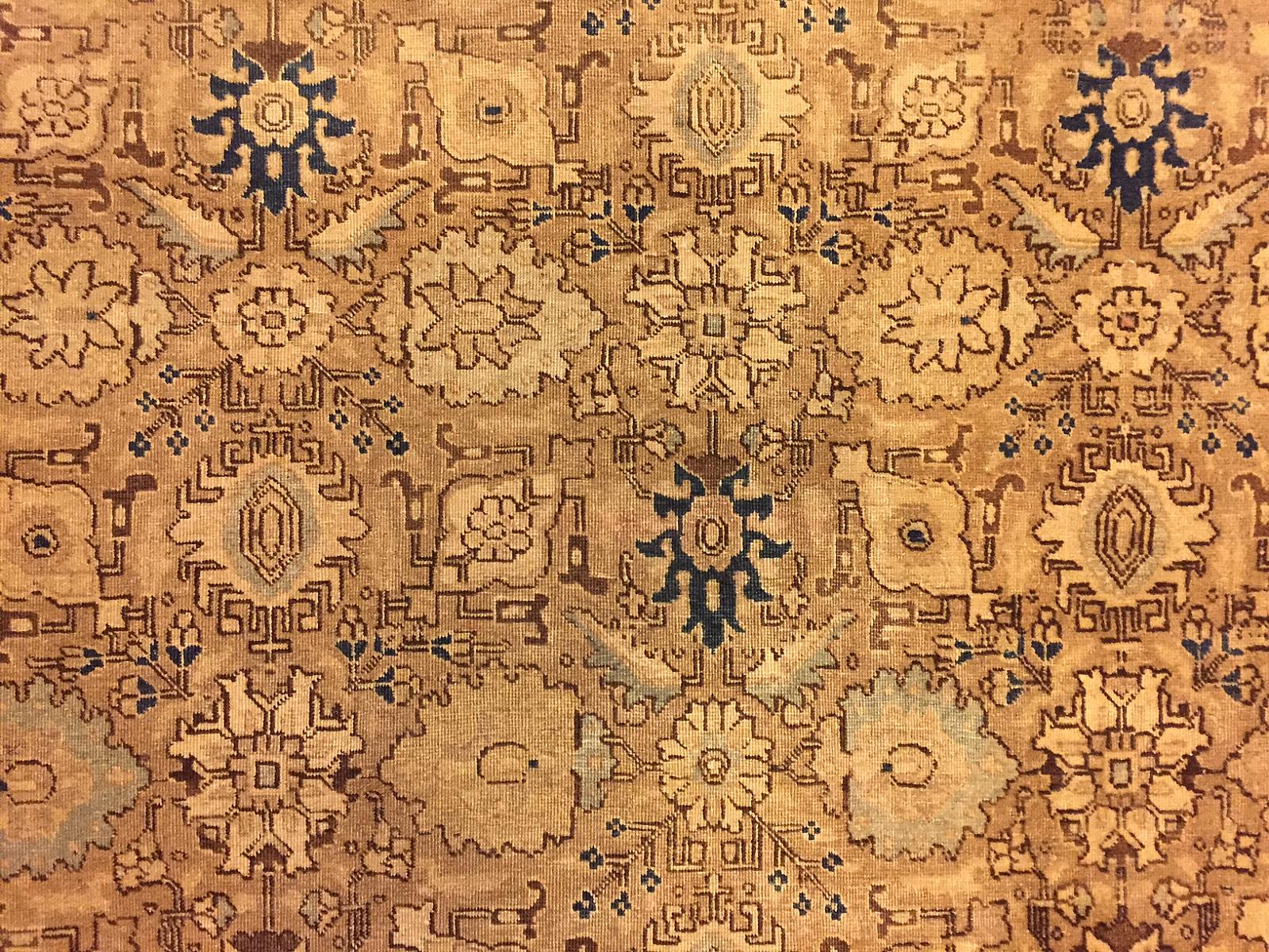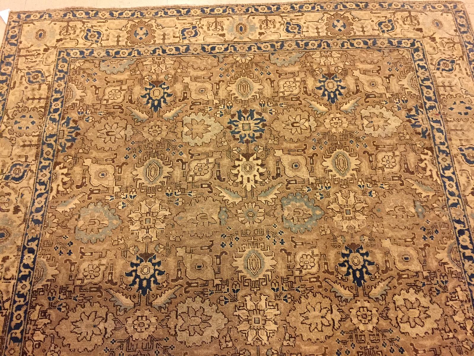 Our antique rugs’ collection includes Aubussons, Heriz and Serapi, Lavar and Kerman, Sarouk, Sultanabad, Tabriz, Oushak and Tapestries.  Tabriz rugs are not distinguished necessarily by a specific pattern or color, although there are some common themes that one can recognize.  Instead, these Persian rugs are known for their high quality and diversity of types.  The tradition in Tabriz is one of the oldest in all of Iran.  Within the rug-making world, families would pass down the skills as an heirloom for future generations.  Centuries of rug weaving have resulted in the fine quality still seen with Tabriz rugs today.