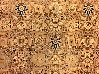 Patterns that were common to see with Tabriz rugs include a classical central medallion with a border weave of fish scales, leaves, stems or flowers.  The border design is often fine and detailed and has been described as lacelike.  Background color was usually cream, red or navy blue.  Coloration typically consisted of soft pastels.  Other patterns you may find include all over patterns or pictorial patterns.  We have a large collection of antique oriental rugs including Persian, Indian, Turkish, Caucasian, Chinese and European rugs. Tabriz rug designers were influenced by Oriental poetry and these influences often were manifested in the design of the rug pattern.  Pictorial patterns of falconry, battle scenes, palaces and even lions are occasionally seen.