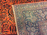 Kashan rugs are typically made with wool or cotton pile.  The finer rugs are made with silk.  Occasionally, you can find these classic beauties made of special wool referred to as kurk wool from the neck of lamb.  These rugs, like many ancient Persian rugs, typically contain a large central medallion with a surrounding geometric pattern.  These rigs may have a dense pattern with intricately designed motifs including florals, arabesques, palmettos, rosettes and leaves.  The dominant or background colors vary and include blues, reds, light greens and beiges. Kashan rugs may come in any size, however, the most common is a mid-size rug.  Like their other Persian rug counterparts, these hand woven masterpieces are revered for their high density knot counts using a Persian knot and their unique intricate design.  Some of these patterns and styles have been passed down from generation to generation from before the 17th century,