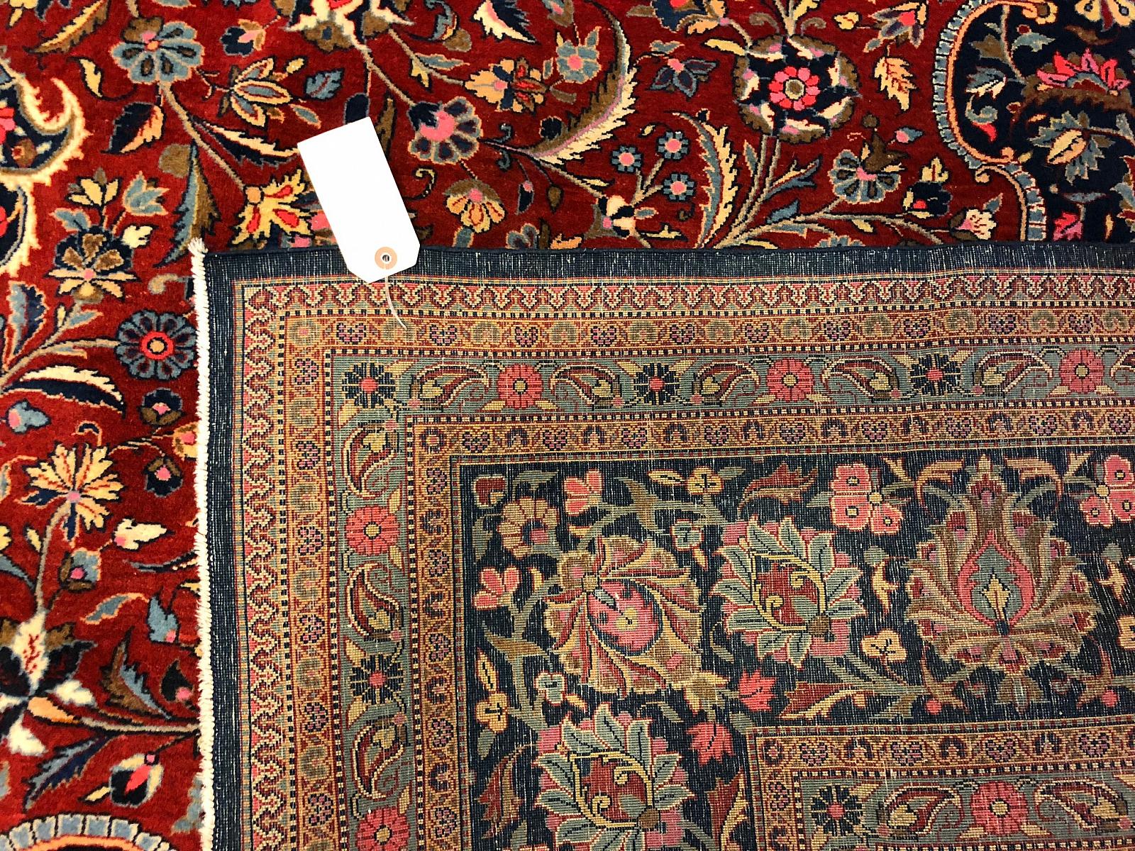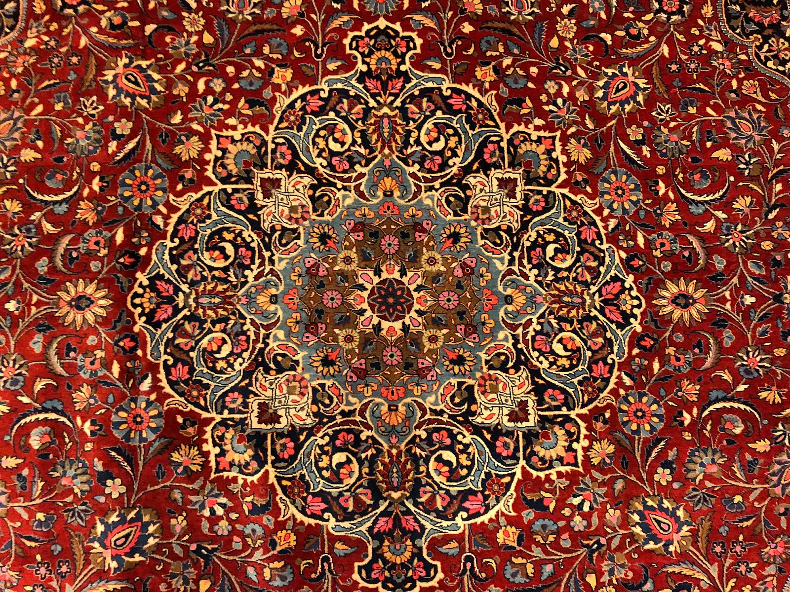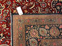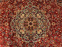 Kashan rugs are typically made with wool or cotton pile.  The finer rugs are made with silk.  Occasionally, you can find these classic beauties made of special wool referred to as kurk wool from the neck of lamb.  These rugs, like many ancient Persian rugs, typically contain a large central medallion with a surrounding geometric pattern.  These rigs may have a dense pattern with intricately designed motifs including florals, arabesques, palmettos, rosettes and leaves.  The dominant or background colors vary and include blues, reds, light greens and beiges. Kashan rugs may come in any size, however, the most common is a mid-size rug.  Like their other Persian rug counterparts, these hand woven masterpieces are revered for their high density knot counts using a Persian knot and their unique intricate design.  Some of these patterns and styles have been passed down from generation to generation from before the 17th century,