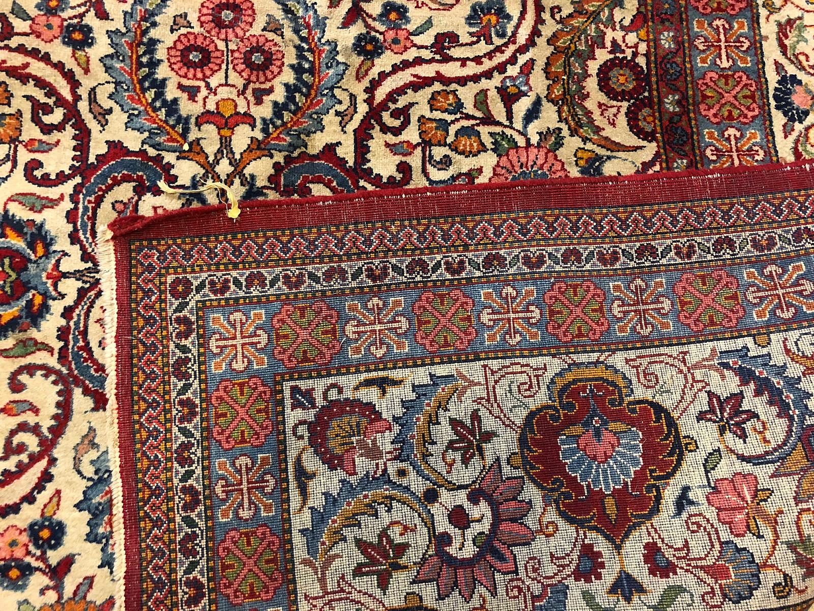 Kashan rugs are typically made with wool or cotton pile.  The finer rugs are made with silk.  Occasionally, you can find these classic beauties made of special wool referred to as kurk wool from the neck of lamb.  These rugs, like many ancient Persian rugs, typically contain a large central medallion with a surrounding geometric pattern.  These rigs may have a dense pattern with intricately designed motifs including florals, arabesques, palmettos, rosettes and leaves.  The dominant or background colors vary and include blues, reds, light greens and beiges. Kashan rugs may come in any size, however, the most common is a mid-size rug.  Like their other Persian rug counterparts, these hand woven masterpieces are revered for their high density knot counts using a Persian knot and their unique intricate design.  Some of these patterns and styles have been passed down from generation to generation from before the 17th century,