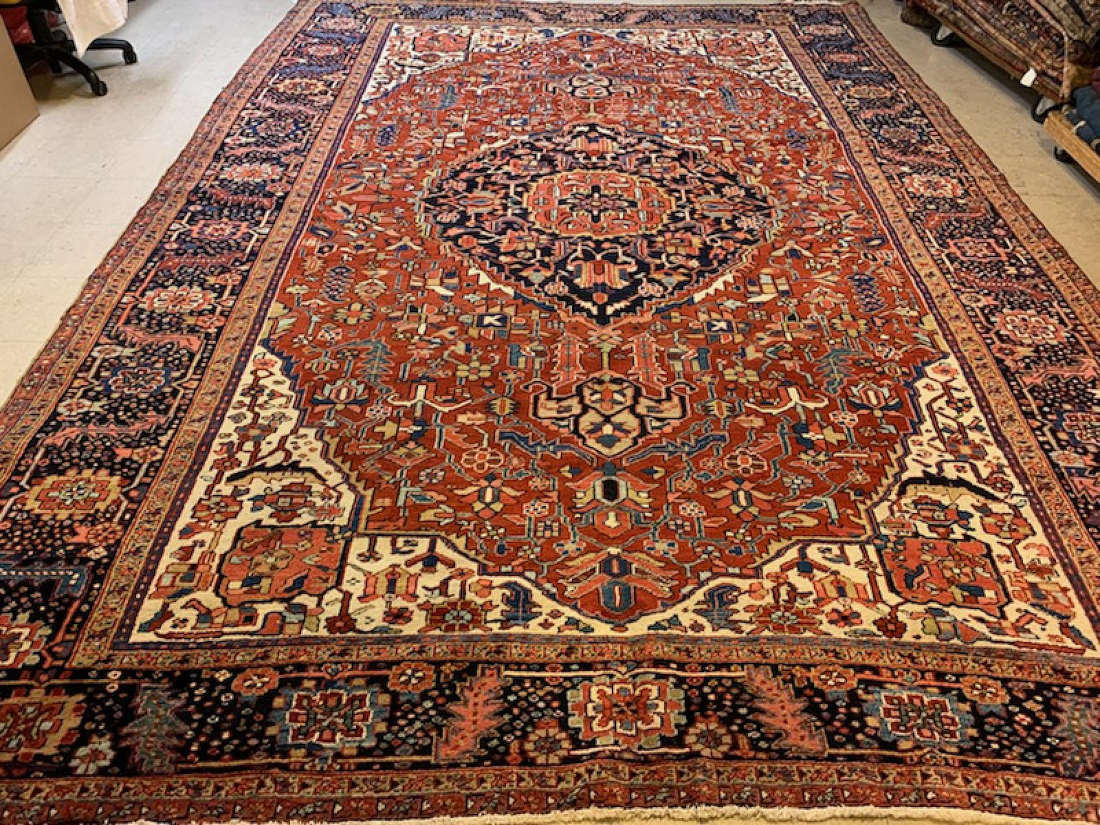 Persian and Oriental rugs are very popular with interior decorators and homeowners for their beauty, individuality and bold colors.   They can be paired with many different types of furniture and looks.  In fact, these rugs are so versatile that they can be moved from space to space as your tastes and needs change.  In addition, the heavy wool pile is both soft and luxurious as well as practical in providing warmth and trapping heat.  Heriz rugs are one of many types of antique oriental rugs available at Aviram Aziz Inc.  We are proud to carry a large selection of antique rugs including Persian, Indian, Turkish, Caucasian, Chinese and European rugs.  No matter what you are in the market for, one of our experts is here to find you just what you are looking for and to verify the rugs origins.