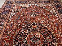 Heriz rugs classically contain a large central medallion with a surrounding geometric bold pattern.  The background is often a deep reddish hue with a blue border and white corner spandrels.  These hand woven masterpieces often have heavier knot counts than other rugs from this region.   The central medallion may vary in size and shape.  Occasionally blue is present in the center but typically dark reddish or tannish hues dominate this central focus.