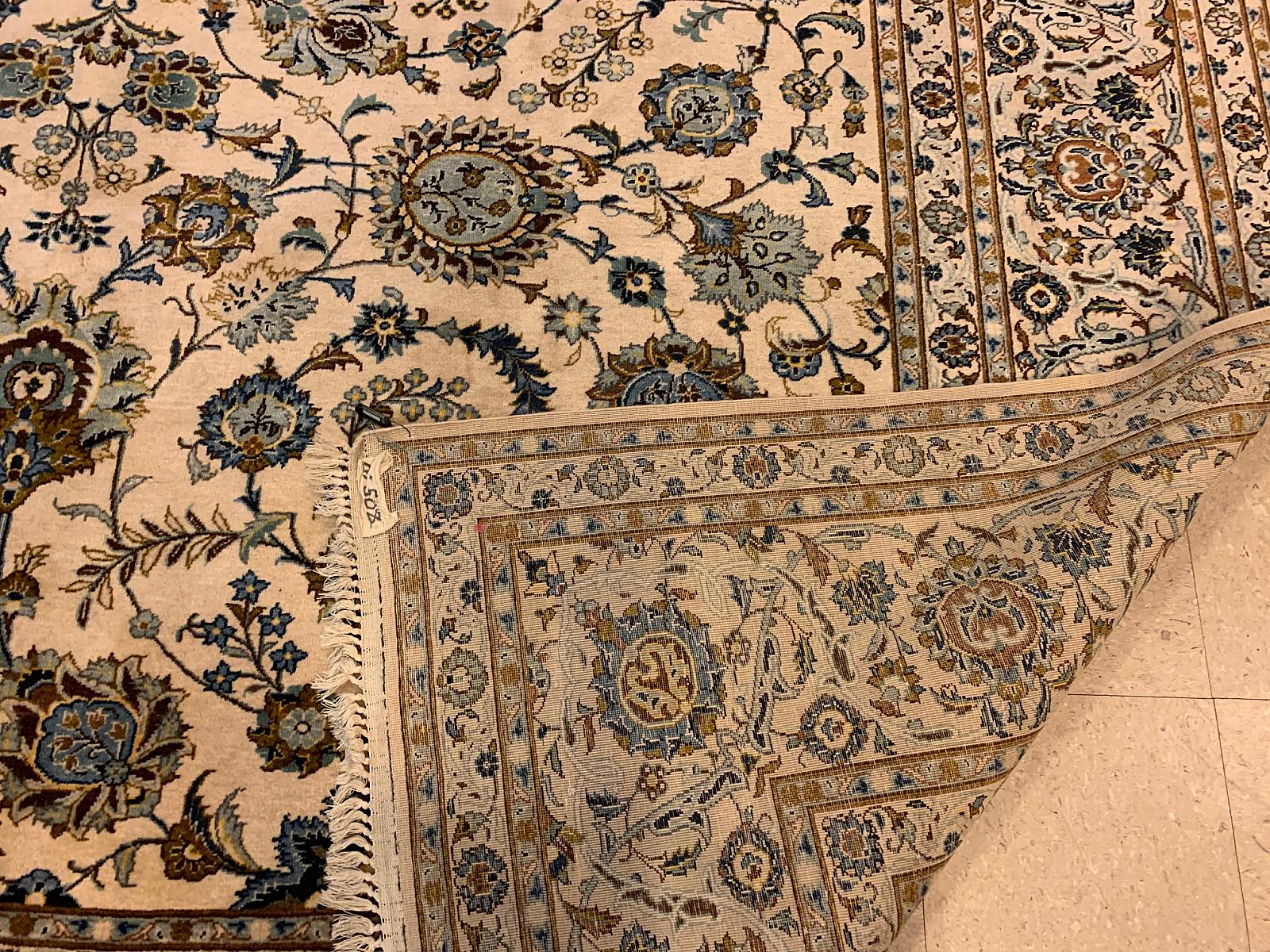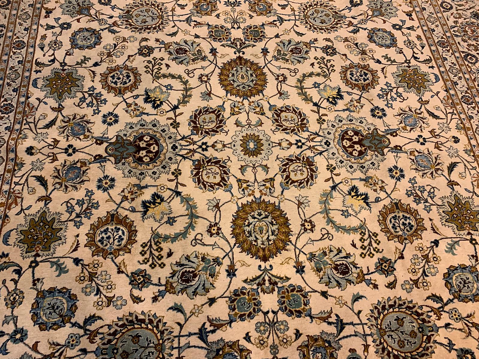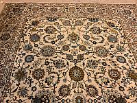 Kashan rugs are typically made with wool or cotton pile.  The finer rugs are made with silk.  Occasionally, you can find these classic beauties made of special wool referred to as kurk wool from the neck of lamb.  These rugs, like many ancient Persian rugs, typically contain a large central medallion with a surrounding geometric pattern.  These rigs may have a dense pattern with intricately designed motifs including florals, arabesques, palmettos, rosettes and leaves.  The dominant or background colors vary and include blues, reds, light greens and beiges. Kashan rugs may come in any size, however, the most common is a mid-size rug.  Like their other Persian rug counterparts, these hand woven masterpieces are revered for their high density knot counts using a Persian knot and their unique intricate design.  Some of these patterns and styles have been passed down from generation to generation from before the 17th century,
