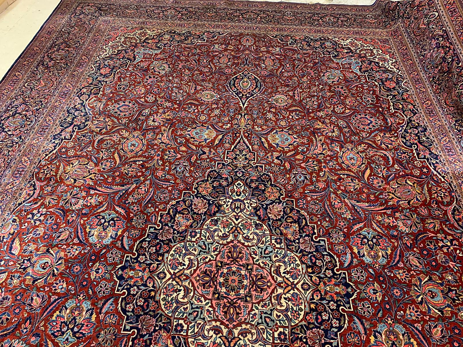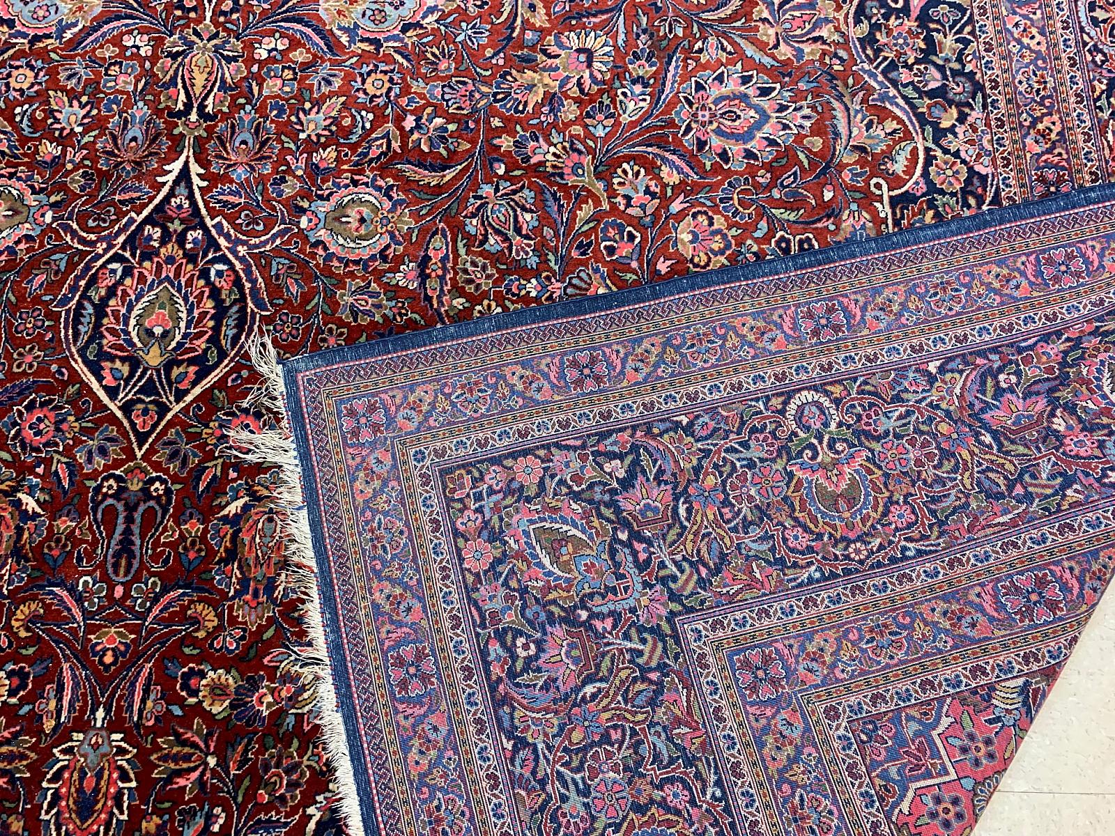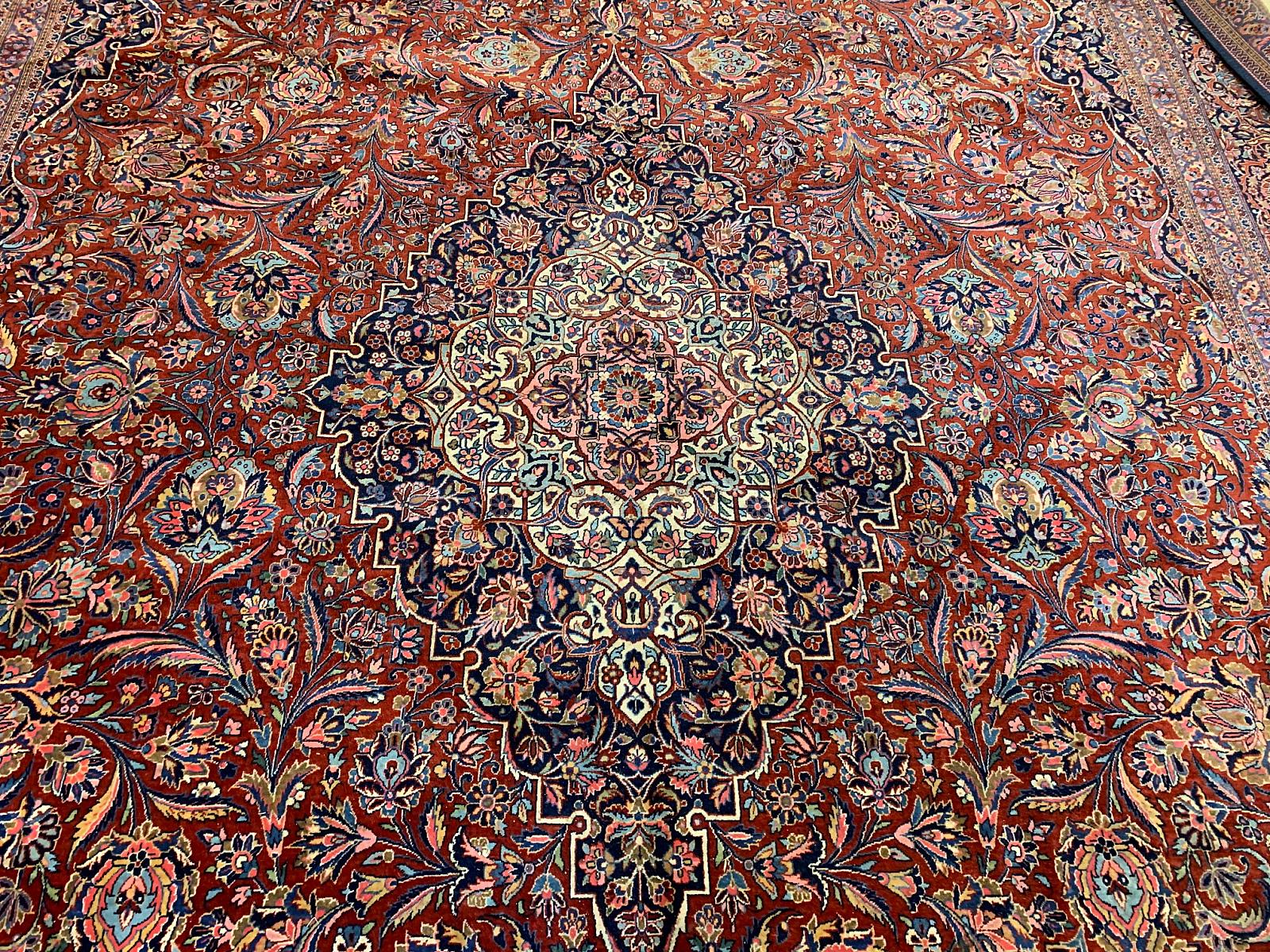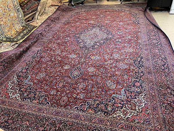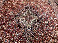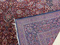 Kashan rugs are typically made with wool or cotton pile.  The finer rugs are made with silk.  Occasionally, you can find these classic beauties made of special wool referred to as kurk wool from the neck of lamb.  These rugs, like many ancient Persian rugs, typically contain a large central medallion with a surrounding geometric pattern.  These rigs may have a dense pattern with intricately designed motifs including florals, arabesques, palmettos, rosettes and leaves.  The dominant or background colors vary and include blues, reds, light greens and beiges. Kashan rugs may come in any size, however, the most common is a mid-size rug.  Like their other Persian rug counterparts, these hand woven masterpieces are revered for their high density knot counts using a Persian knot and their unique intricate design.  Some of these patterns and styles have been passed down from generation to generation from before the 17th century,
