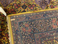 Kashan rugs are typically made with wool or cotton pile.  The finer rugs are made with silk.  Occasionally, you can find these classic beauties made of special wool referred to as kurk wool from the neck of lamb.  These rugs, like many ancient Persian rugs, typically contain a large central medallion with a surrounding geometric pattern.  These rigs may have a dense pattern with intricately designed motifs including florals, arabesques, palmettos, rosettes and leaves.  The dominant or background colors vary and include blues, reds, light greens and beiges. Kashan rugs may come in any size, however, the most common is a mid-size rug.  Like their other Persian rug counterparts, these hand woven masterpieces are revered for their high density knot counts using a Persian knot and their unique intricate design.  Some of these patterns and styles have been passed down from generation to generation from before the 17th century,