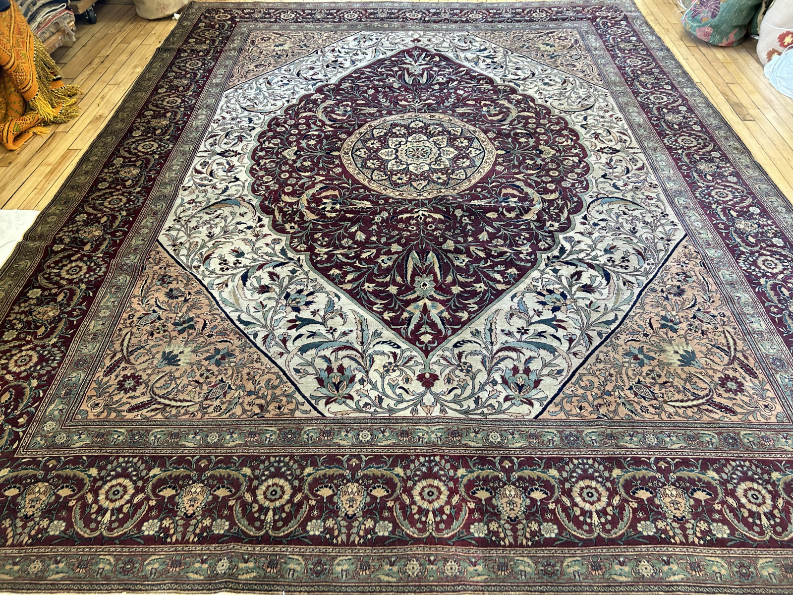 Our antique rugs’ collection includes Aubussons, Heriz and Serapi, Lavar and Kerman, Sarouk, Sultanabad, Tabriz, Oushak and Tapestries.  Tabriz rugs are not distinguished necessarily by a specific pattern or color, although there are some common themes that one can recognize.  Instead, these Persian rugs are known for their high quality and diversity of types.  The tradition in Tabriz is one of the oldest in all of Iran.  Within the rug-making world, families would pass down the skills as an heirloom for future generations.  Centuries of rug weaving have resulted in the fine quality still seen with Tabriz rugs today.