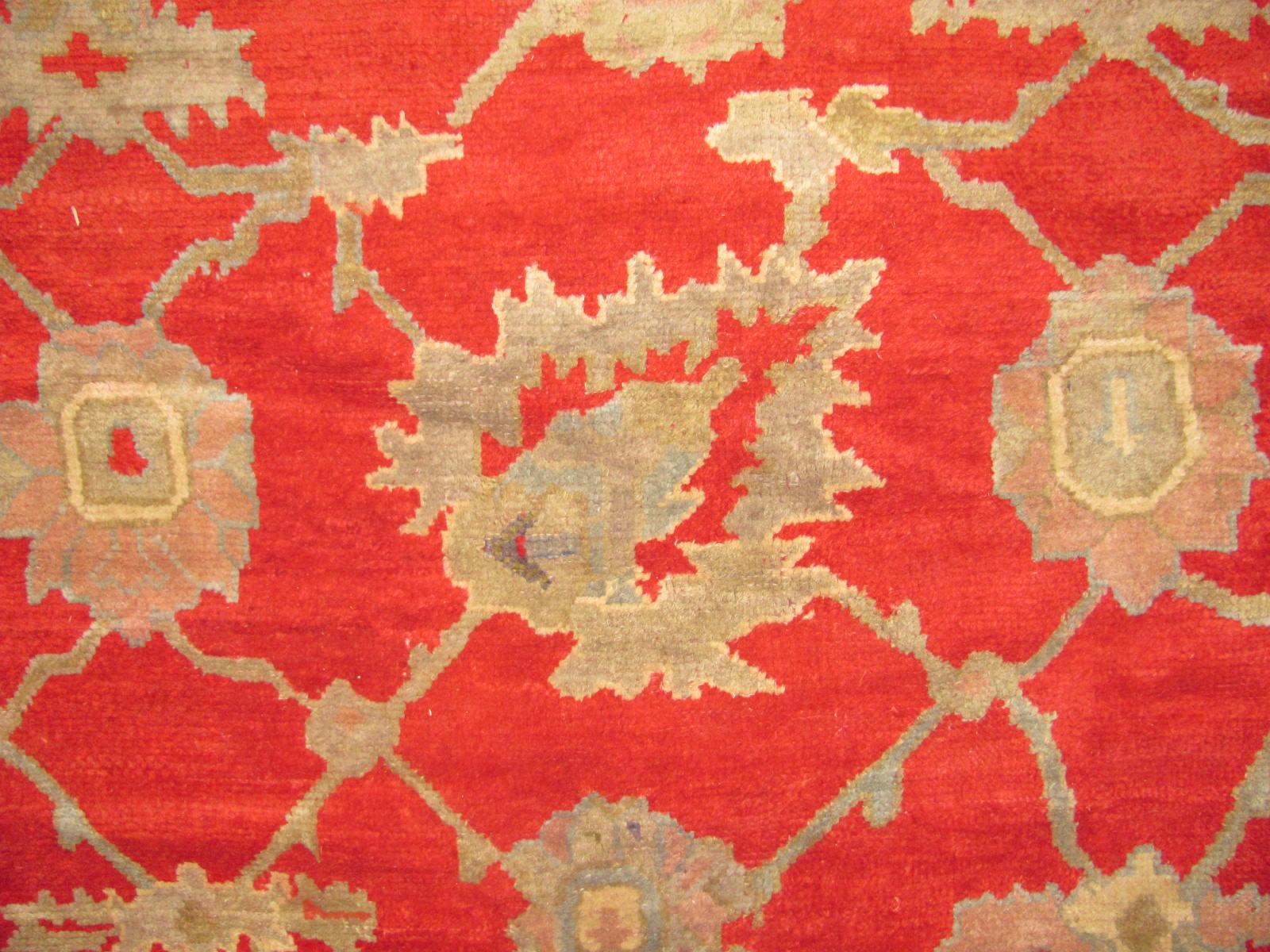 The distinctive style and color of Oushak Rugs include shades of orange color. Some of the most popular shades are salmon, coral, cinnabar, etc. These shades are combined with hues of maroon, blue and red. This color combination makes them very attractive and unique. The motifs are generally of varied colors which include browns, blues, yellow, green, black and ivory. The base is made of wool and the use of symmetrical knot for structure is in abundance.